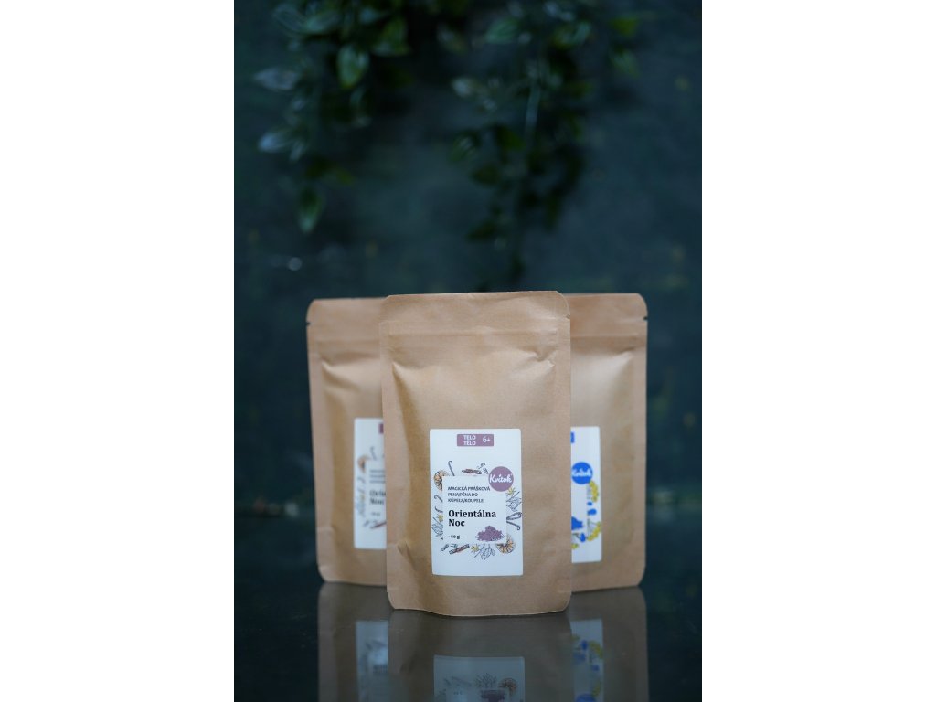 Orientální noc: Sodium Bicarbonate (sóda bikarbóna), Citric Acid (kyselina citrónová), Sodium Lauryl Sulphoacetate (jemný tenzid z kokosového oleja), Magnesium Sulphate Heptahydrate (epsomská soľ), Prunus Amygdalus Dulcis Oil (mandľový olej), Juglans Regia Seed Coat Powder (orechový prášok), Santalum Spicatum Oil (esenciálny olej Santalové drevo), Citrus Aurantium Dulcis Peel Oil Expressed (esenciálny olej Pomaranč), Vanilla Plantifolia Fruit Extract (vanilkový CO2 extract), Canaga Odorata Flower Oil (esenciálny olej Ylang Ylang), Citrus Aurantium Bergamia Fruit Oil (esenciálny olej Bergamot FCF), Pogostemon Cablin Oil (esenciálny olej Pačuli), *Limonene, *Linalool