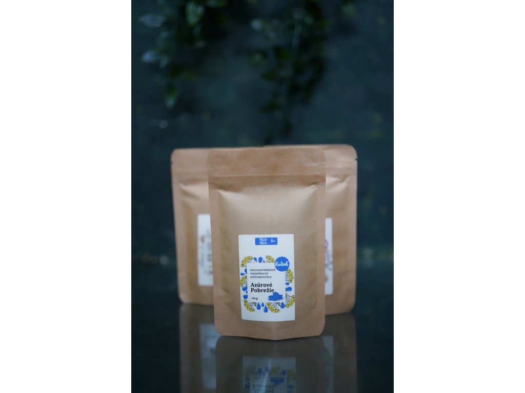 Azurové pobřezí: Sodium Bicarbonate (sóda bikarbóna), Citric Acid (kyselina citrónová), Sodium Lauryl Sulphoacetate (jemný tenzid z kokosového oleja), Magnesium Sulphate Heptahydrate (epsomská soľ), Prunus Amygdalus Dulcis Oil (mandľový olej), Spirulina Platensis Powder (rastlinný prášok zo sladkovodnej riasy Spirulina), Tanacetum Annuum Flower Oil (esenciálny olej Tansy Blue), *Limonene