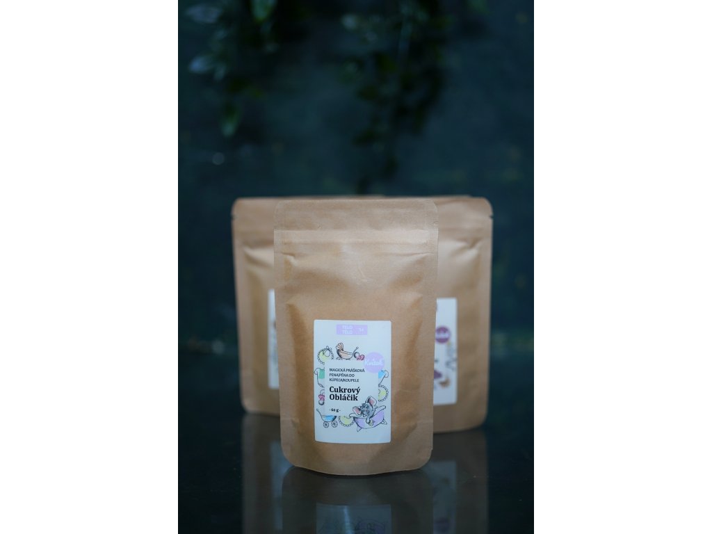 Cukrový obláček: Sodium Bicarbonate (sóda bikarbóna), Citric Acid (kyselina citrónová), Sodium Lauryl Sulphoacetate (jemný tenzid z kokosového oleja), Magnesium Sulphate Heptahydrate (epsomská soľ), Prunus Amygdalus Dulcis Oil (mandľový olej), Beta Vulgaris Rubra Root Powder (prášok z červenej repy), Parfum (zmes prírodných aromatických látok z rastlinných surovín)